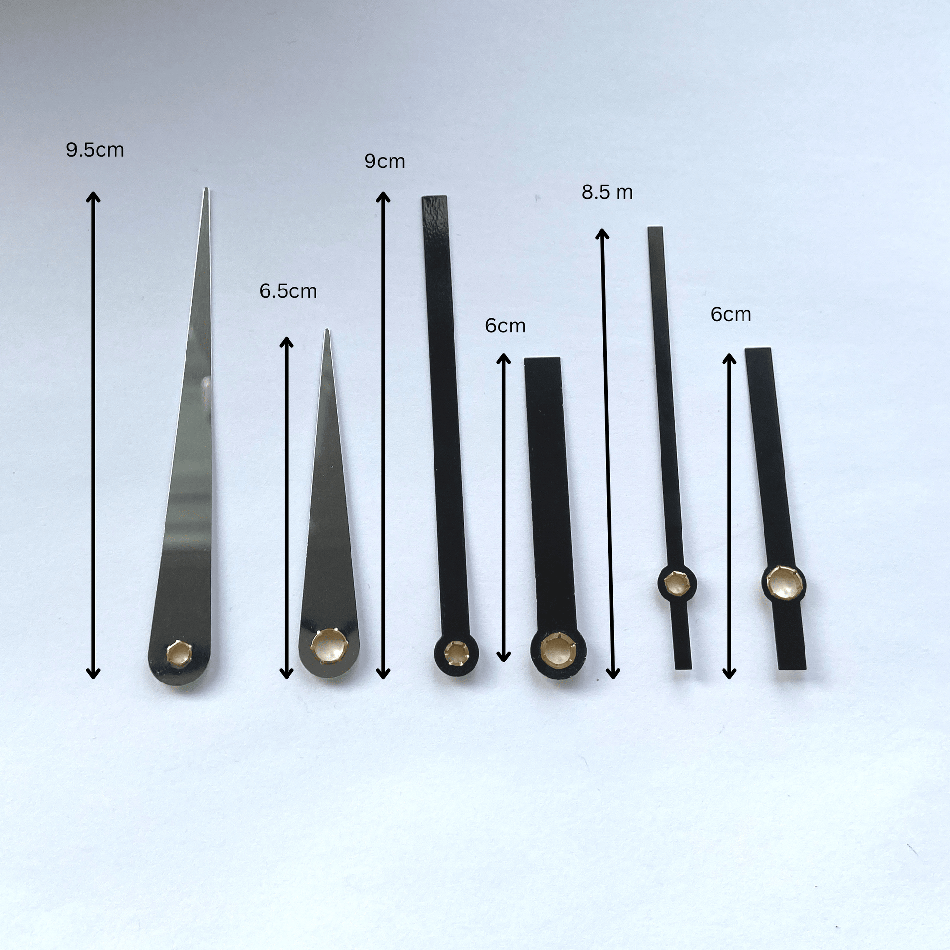 The hands you need to have a beautiful clock on the wall. A clock hand is an arm that connects to the shaft on a clock movement that overlays over a clock dial face and points to the numerals or symbols on the clock face or watch that displays the time. Most clocks have a short hour hand a long minute hand and a long second hand to display the time. This set contains of 3 small sets of hands for a clock that must be bigger then Ø20cm diameter.