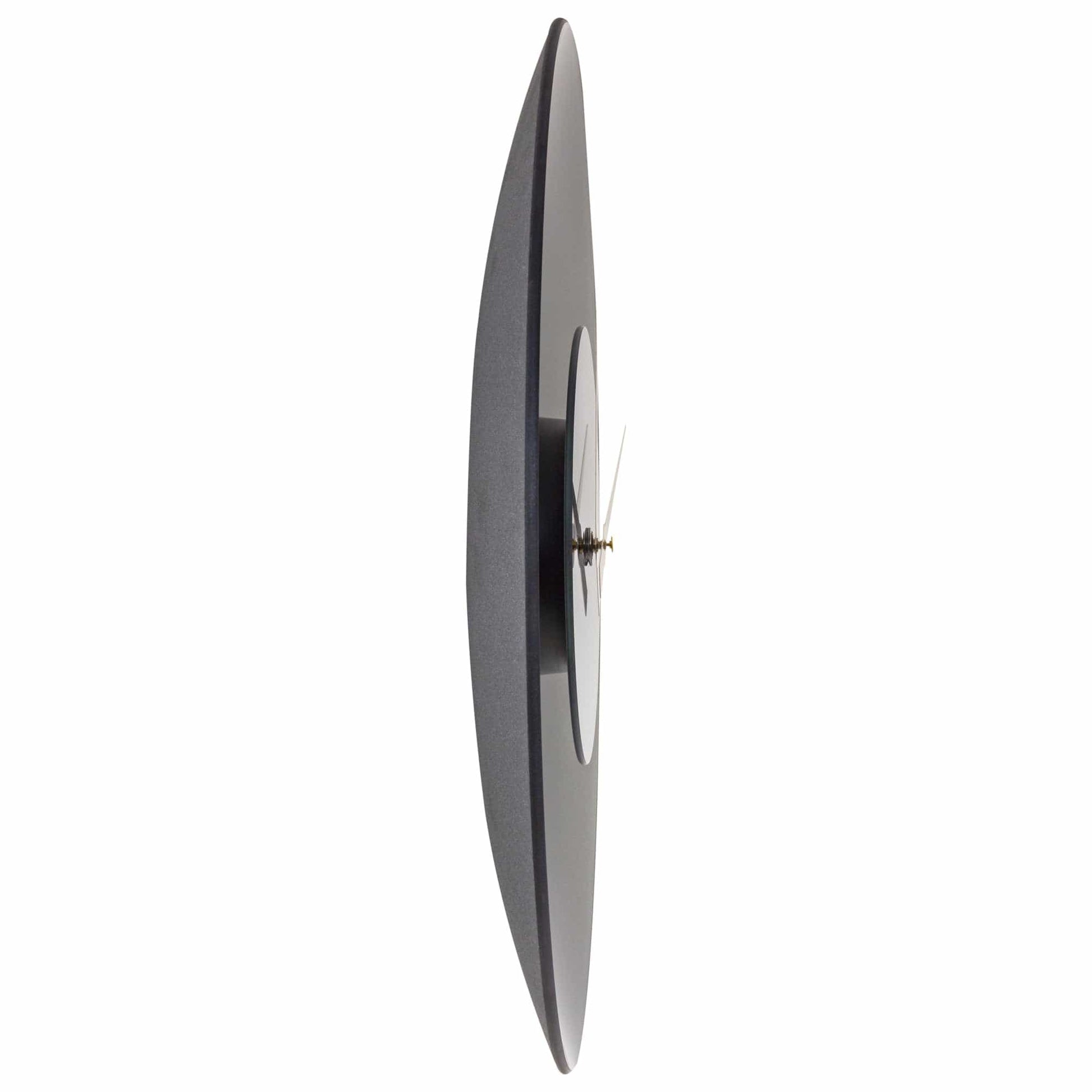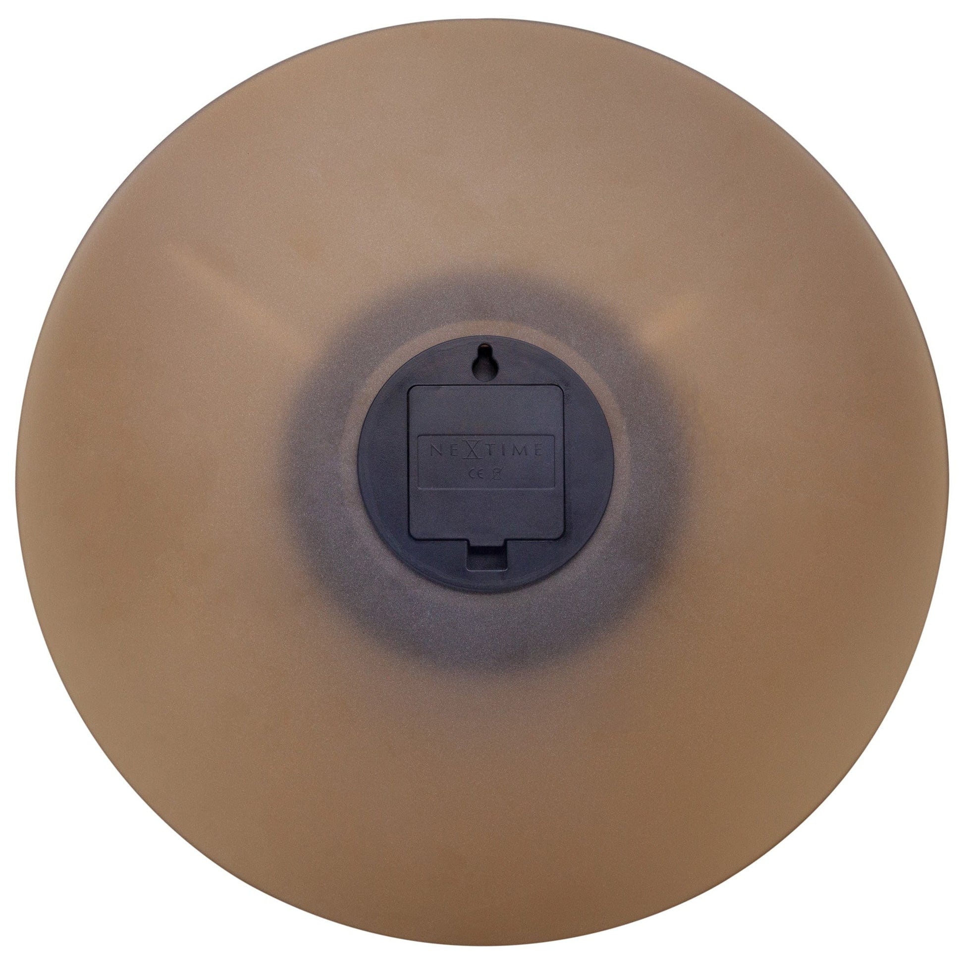 NeXtime Float (Ø 40cm) is a silent wall clock that uses glass as the primary material. It floats effortlessly on the wall with a curved frosted glass in grey set behind a black glossy dial and golden hands, creating a contrast between the soft and hard, and the solid and opaque.