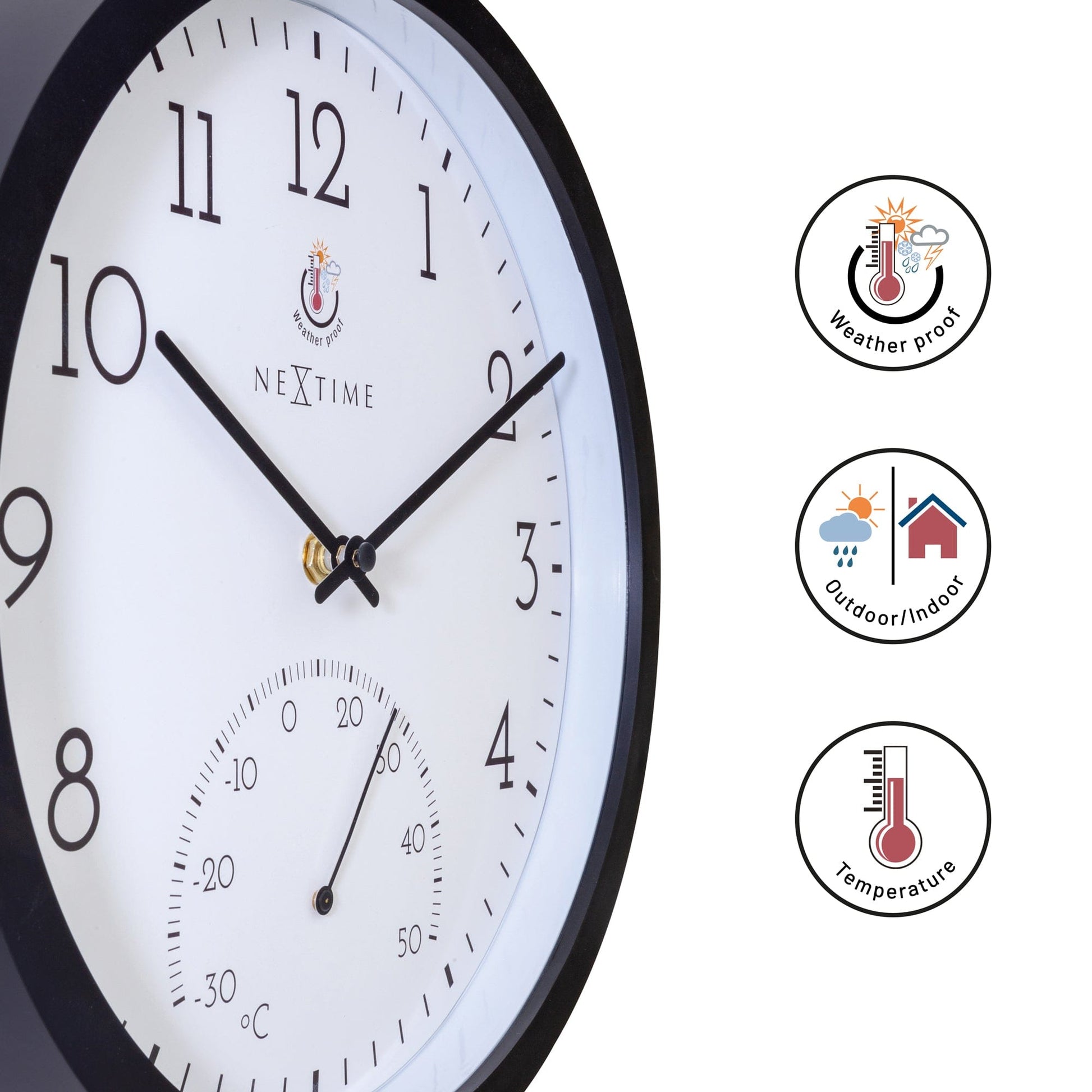 The NeXtime Marigold (30.5cm) wall clock shows you, besides time, also the current temperature in Celsius. The clock has a minimlist design with a black case, a white dial with a clear black number/ stripe index and black hands. The clock suits perfectly in any room, kitchen, indoor or outdoor like garden, balcony. This clock is weatherproof and runs on 1 x AA battery (not included).